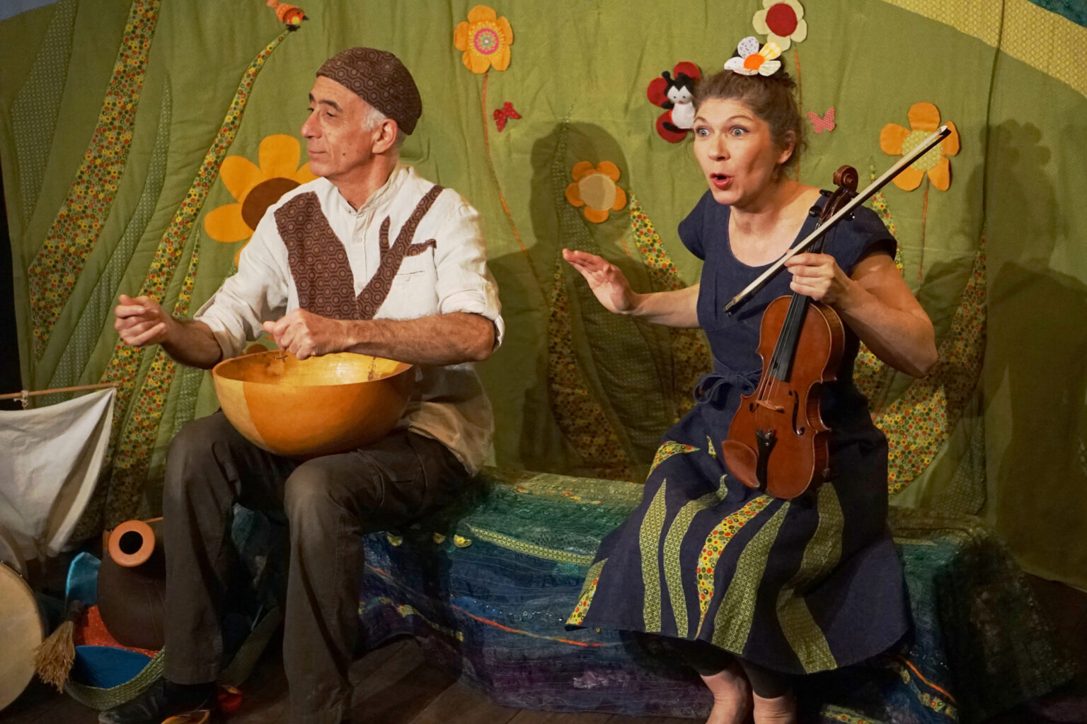 Un spectacle joyeux et poétique, où comptines et chansons se mêlent au violon et aux percussions.